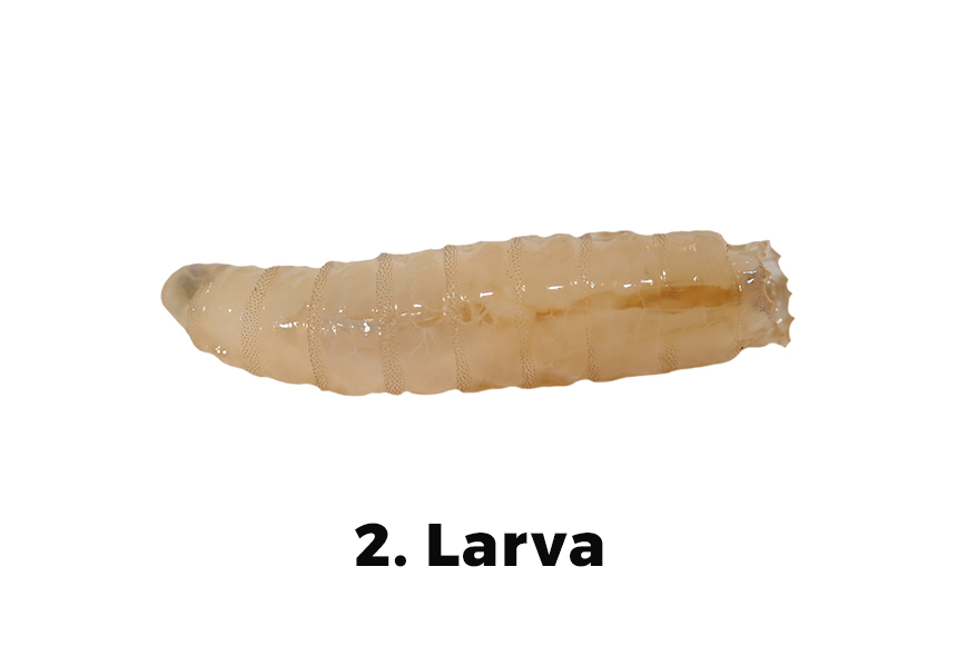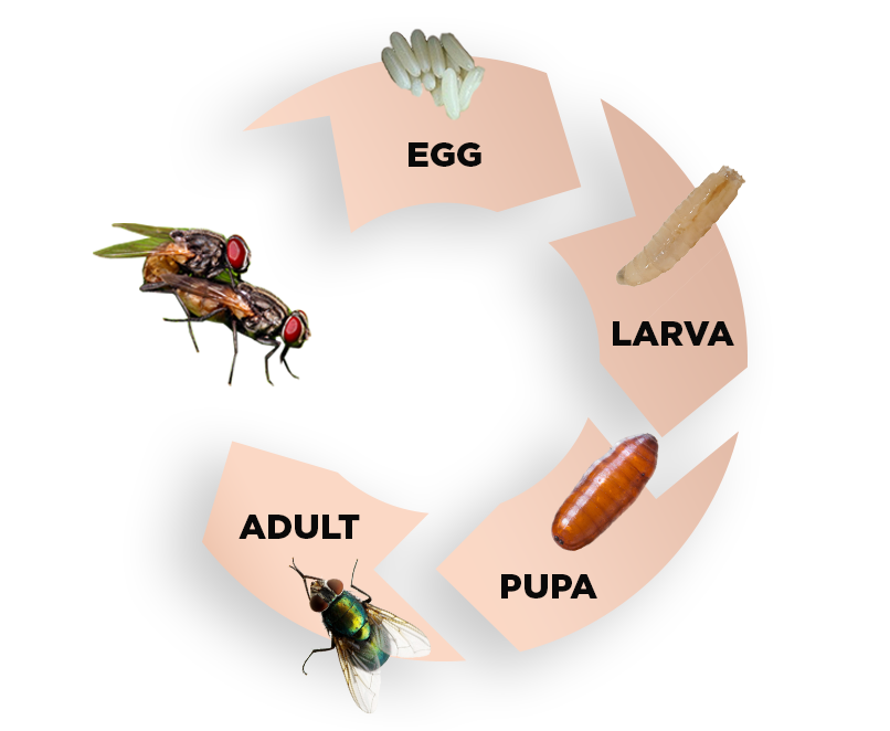 Adult filth flies deposit eggs in decaying organic matter. Manure is the main culprit, but wet feed, silage, straw, hay, leaves, etc., can rot and decompose and then they can become fertile fly breeding grounds as well. If you have manure you will have flies! The eggs quickly hatch into larvae and it is during this life stage that they do all of their growing. These are more commonly known as maggots. They are white and are easy to see because they squirm when disturbed. As it goes through its development, each larva eventually transforms to the non-feeding pupal stage. At this stage it forms an armour-like coating, which is formed from the larval skin and protects the pupa during its metamorphosis to an adult fly. Upon emergence, the adult fly can soon mate and lay eggs and so repeat the life cycle.
