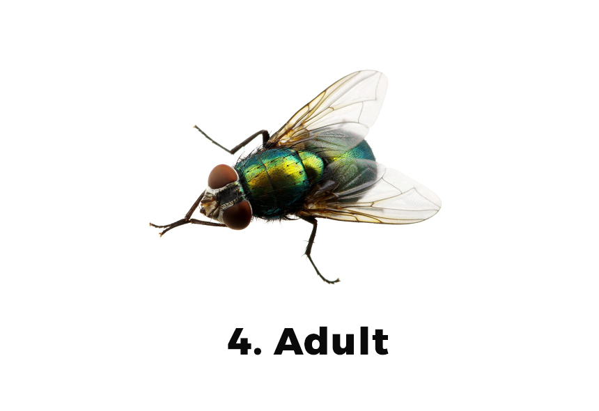 Most treatments to control flies target only the adult stage. Those strategies include pesticides, sticky sheets or strings, fly bait, fly traps, and bug zappers. However, during most of the season, adult flies represent only around 20% of the total fly population. In the manure and other breeding grounds, you will find a combination of fly eggs, larvae, and pupae and together they represent the other 80%.