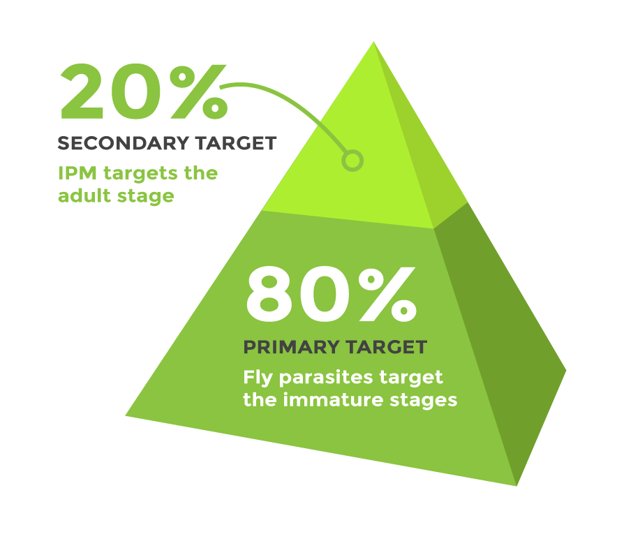 These adult-targeted fly control techniques can all be effective tools in an Integrated Pest Management (IPM) system but by using only these elements the most you can hope for at any given time is to control 20% of the fly population. Even with a powerful and toxic pesticide application, you may notice a sudden drop in your fly population, but just days later you may have flies everywhere again! This is because the immature stages of flies are not targeted for control, and they represent the overwhelming majority of the fly population. They will soon emerge from hidden pupae and return in abundance.