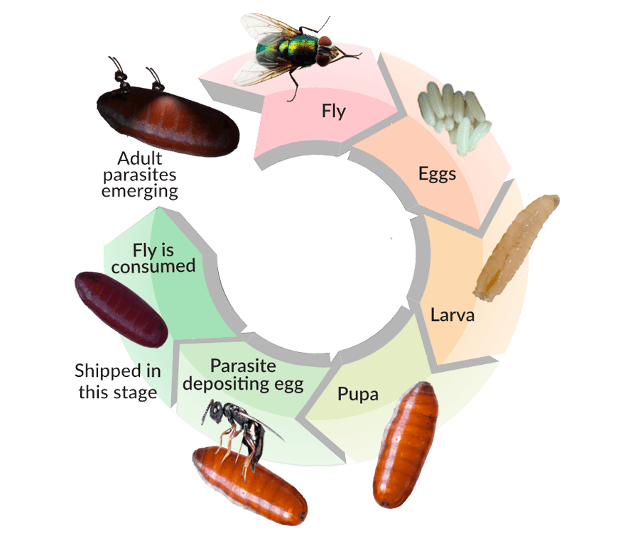 This is why fly parasites are so effective: they get to the root cause of the problem and deal with it there. They kill the fly pupa before it has a chance to finish its development. By breaking the life-cycle of the fly they don’t give it a chance to become an adult fly and therefore to do any damage.