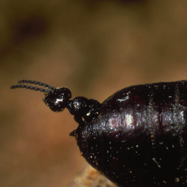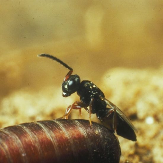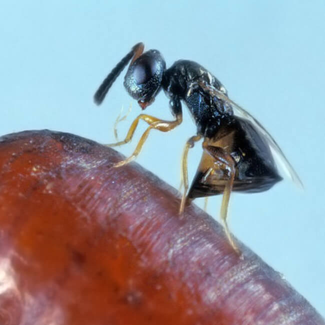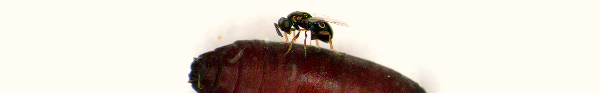 Fly parasites instinctively search around fly breeding areas - not only on the surface but they can burrow more than 10 cm under the surface as well. When an adult female locates one, she uses an egg-laying device on the end of her abdomen called an ovipositor to pierce a hole through the hard fly pupa casing and inject one or more eggs inside.